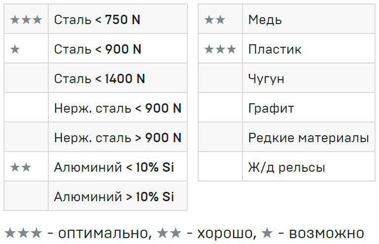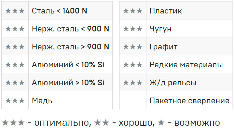 Подходит для легированной хромом стали, например V2A и V4A, нержавеющей стали и стального литья, цветных и легких металлов, пластмасс, армированных материалов, гипсовых и облегченных строительных плит, переработанной древесины до 30мм.